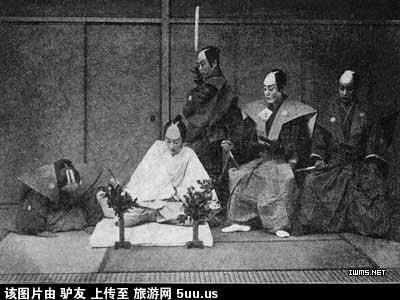 | 旅游网:现在普遍认为,古代许多的国家和民族,均主张人的灵魂是宿于肚腹中的;因此,武士便在有必要将自己的灵魂向外展示的时候,采取剖腹以示众人的方法和仪式。 穿着传统服装的日本切腹人(白衣者),站在其后的是介错人