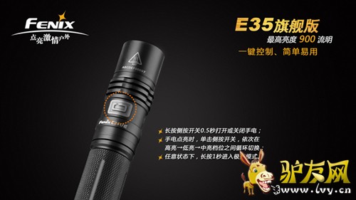 驴友网:Every Day Carry + Easy to Use的设计理念,催生的了Fenix E系列户外运动手电。简洁实用的档位,方便快速的操作,再加上防水防跌等高可靠性设计,让它在户外运动、每日携带中,都成为了不可或缺的照明工具。E35作为E系列的代表产品,日前迎来了其新版本—E35旗舰版。![]() E35旗舰版拥有900流明极亮模式和大泛光光学设计,在保持原E35三档亮度和单按键操作的基础上,采用了全新设计的三重散热环和防滚筒身结构。同时兼容可充18650锂离子电池和耐寒的一次性CR123A锂电池,E35旗舰版最高亮度达900流明,最长续航达140小时。 ![]() E35旗舰版使用的是Cree XM-L2 U2 LED,寿命长达50000小时。 ![]() 同时该手电采用了简单实用的一键控制设计,及侧按开关/调光/进入极亮模式。在任意状态下,长按侧按开关1秒,手电即进入900流明极亮模式,松开后则恢复先前状态。 此外,快速轻按侧按键则可以打开或关闭手电,开启手电后,轻按侧按键则可进行实用的3档调光。 ![]() E35定位为远射手电,因此泛光角度小。而新版本的E35旗舰版则采用了大泛光光学设计,照射范围更广,视野更加开阔,应用场合更加广泛。 E35旗舰版与PD35、UC40旗舰版同属Fenix单电池单LED超高亮手电阵营。相较于双按键操作的经典手电PD35和自带电池USB充电的UC40旗舰版手电,E35旗舰版拥有更短的筒身,具有极强的性价比,是Fenix小直筒手电阵营的有力补充。 ![]() 电路设计一直是Fenix的传统优势,E35旗舰版同样拥有独具特色的恒流电路,且电路效率极高,能有效保证手电亮度恒定。此外,该电路还具有智能记忆功能,开启手电后会默认为关闭前的亮度档位。 Fenix所有手电均拥有IPX-8级防水功能,按照美国ANSI标准,即可以水下2米30分钟防水。Fenix承诺,所有手电测得参数绝不虚标乱标,严格参照最新美国ANSI手电标准进行测试,数据科学真实。 ![]() Fenix是 户外 运动照明的领导品牌,专注于户外运动照明工具的研发、制造及销售,产品涵盖中高端手电、 头灯 、 自行车 灯等系列,性能卓越、品质可靠,是为数不多的具有国际竞争力的国产品牌。目前Fenix照明产品已销往全球100多个国家和地区,并赢得了全球消费者的一致认可和口碑美誉。 |