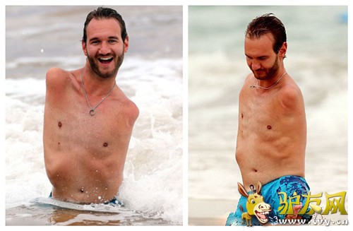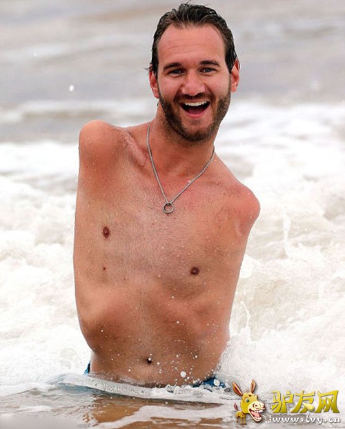 据英国《每日邮报》4月2日报道,澳大利亚男子尼克•胡哲(Nick Vujicic)今年31岁,患有罕见的先天性四肢切断症,生下来就没有四肢。作为一名神父,他将自己的身体缺陷转化为一种动力,将基督教福音传遍世界。近日,尼克在毛伊岛度假,玩海上冲浪,并准备发行新书《顽强地活下去》(Stand Strong)。 ![]() ![]() 尼克的一生生动地阐释了一个人是怎样战胜困境的。他能够在海滩上快乐地游玩证明了他已经学会了如何面对并战胜困难。尼克已经在44个国家通过公众演讲以及发行励志书籍来传播希望,告诉人们如何将恐惧转换为动力。 ![]() 在尼克6岁的时候,父亲就教他如何打字,妈妈则发明了一种特殊的塑料设备帮他握住笔。尽管考虑到儿子上学可能会被欺负,但是父母还是坚持将尼克送入主流学校学习。在学校,尼克做着电动轮椅,虽然被人嘲笑,但是还有很多同学帮助他。尼克也曾有自杀的行为,但是在宗教信念、朋友及家人的关心鼓励下,尼克最终恢复了信心,成为了一名战胜困境的国际性代表人物。2012年,尼克与宫田加苗(Kanae Miyahara)结婚,婚后有了儿子,开始了甜蜜的婚姻生活。 ![]() |
