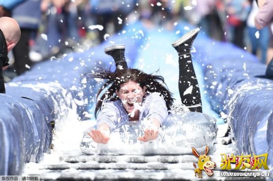 英国民众体验90米超长水滑梯 街道变疯狂游乐场
