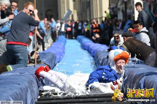当地时间2014年5月4日,英国布里斯托尔,民众街头体验艺术家Luke Jerram设计的一个长达90米的超长滑水装置,街道瞬间变身疯狂游乐场,据了解,此次活动有超过95000人报名参加,但有幸能体验超长水滑梯的只有360人。