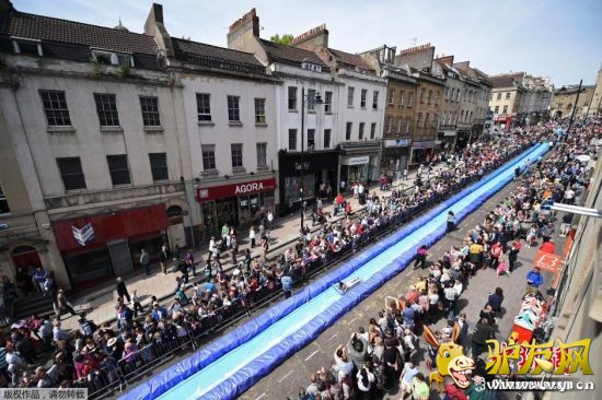 : 当地时间2014年5月4日,英国布里斯托尔,民众街头体验艺术家Luke Jerram设计的一个长达90米的超长滑水装置,街道瞬间变身疯狂游乐场,据了解,此次活动有超过95000人报名参加,但有幸能体验超长水滑梯的只有360人。& ...