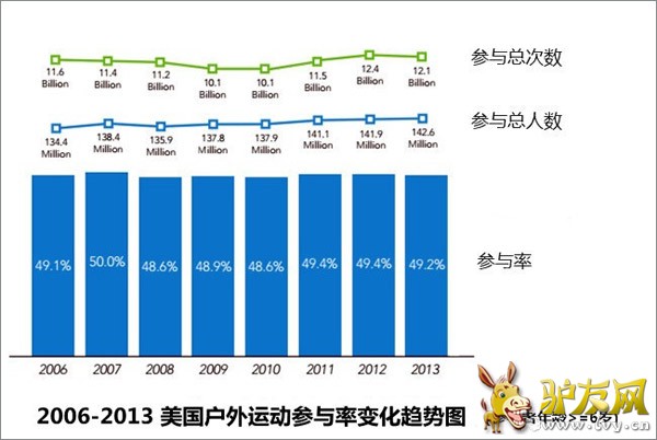 据美国户外基金会最新出炉的《美国2014年户外休闲参与报告》显示,2013年,美国户外运动参与人数创2006年调查以来历史之最,总人数达1.426亿人,比2012年增长70万但由于人口的增加,所占比重比2012年略下降0.2%至49.2%。此外,美国户外活动总次数达124亿,平均每名参与者87.4次。![]() 与2012年相比,排除25-44岁,及45+岁两个年龄段外,其他各年龄段人群户外活动的参与率基本都保持增长或平稳的趋势。以上两个年龄段都下降了1%。 ![]() 该报告还显示,13-17岁这个阶段的青少年参与率保持平稳,6岁-12岁的少年及18岁-24岁的青年人参与率保持温和上涨。综合来看,年轻人一年全年户外出行次数达50亿次,人均达99次。而2013年,25岁以上成年人的参与率与之相比稍显逊色,人均77次。 在整体参与方面,年轻人参与最广泛的户外活动依然是跑步、骑行、钓鱼、露营和远足。成人方面有类似的趋势。 青少年参与最广泛的户外运动: 1.跑步、慢跑、越野跑 参与率:29.3%总参与人数:2380万 2.骑行 参与率:18.4%总参与人数:1490万 4.露营 参与率:17.2%总参与人数:1390万 5.徒步 参与率:13.1%总参与人数:1060万 青少年参与频率最多的户外运动: 1.跑步、慢跑、越野跑 每位跑者平均81.6次总参与次数:19亿次 2.骑行(公路、山地、极限小轮车) 每位骑行者平均67.5次总参与次数:13亿次 3.滑板 每位滑板爱好者平均60.7次总参与次数:2.859亿次 5.观鸟 每位观鸟者平均28.2次,总参与次数:8300万 4.野生动物观测 每位观察者平均21.7次总参与次数:1.077亿次 根据美国人多年的户外休闲参与报告对比发现,近几年来,竞技项目的参与人数呈上升趋势,例如探险比赛、马拉松的参与人数在过去三年来都有明显增长,水上运动如站立式滑水、皮划艇、钓鱼在过去几年来参与的人数也越来越多。 |