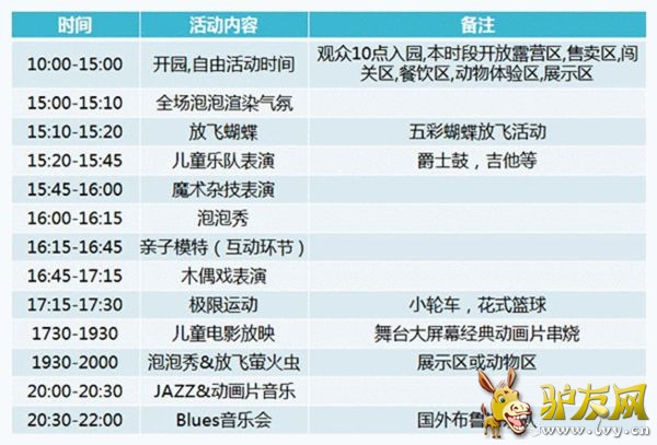 各场地活动项目介绍 整个活动场地分为表演区、闯关区、露营区、餐饮区、动物体验区、展示区和售卖区七个主要活动区。作为亲子休闲为主的音乐生活节,这其中最吸引人的项目主要集中在表演区和闯关区,一些休闲娱乐的项目在分散在动物体验区和露营区当中,除了具有功能性的露营区、展示区和餐饮区外,另外还有一些主题活动和电影放映活动等其他活动穿插补充期间。 推荐游览线路:由于各个区域的活动时间安排不同,上午和中午到达活动场地后,从亲子节园区入口进入,可以沿露营区——动物体验区——闯关区游览体验,中午可在餐饮区就餐。下午休息过后,可以在餐饮区西侧的展示区稍作停留,而后穿过展示区向西,当下午3点表演区活动正式拉开帷幕的时候,赶到表演区,去欣赏精彩的演出和体验充满乐趣的体验交互活动。除自费的餐饮和帐篷租赁费用外,门票包含了所有的娱乐游览项目,可是要痛快的体验一番呢。 推荐必玩项目/必看演出: 表演区:放飞蝴蝶活动、魔术杂技表演、放飞萤火虫活动、木偶戏表演、泡泡秀、布鲁斯音乐会 闯关区:大型闯关充气城堡、闯关亲子游戏 动物体验区:小猪跳水、小猴投篮 其他项目:泡泡主题活动、露天电影展播 一、表演区——每天15:00-22:00开放 1、放飞蝴蝶活动 推荐指数:★★★★★ 很久以前,蝴蝶就以其身美、形美、色美、情美被人们欣赏,历代咏诵。蝴蝶是最美丽的昆虫,被人们誉为"会飞的花朵"、"虫国的佳丽",是一种高雅文化的象征,可令人体会到回归大自然的赏心悦目。活动现场举办"放飞蝴蝶放飞梦想"活动,让小朋友在爸爸妈妈的陪同下,与翩翩起舞的蝴蝶们亲密接触。让孩子回归大自然热爱小生命,在露营大会过一个"放飞蝴蝶放飞梦想"的端午节。 2、极限运动表演 推荐指数:★★★ 极限运动里,舞台表演是最精彩的,选手在舞台上以轮滑、滑板、小轮车利用惯性飞到空中做翻腾、旋转、高抛等高难度的动作,整场表演惊险刺激。表演包括小轮车和花式篮球。平地花式小轮车:动作有上百种,最基本的是车上静平衡,比如前轮抬起,后轮点地跳,或是前轮点地跳,还有擦轮、定车、飘、过桥等。花式篮球:适合全家人一起欣赏的独一无二的令人惊叹的演出,拥有强烈的娱乐传统和团体参与性。 3、民间艺术表演 推荐指数:★★★★ 现场组织木偶戏、魔术杂技和小丑等民间艺术的表演。其中精妙绝伦的木偶戏是用木偶来表演故事的戏剧,表演时,演员在幕后一边操纵木偶,一边演唱,并配以音乐。让孩子们感受传统文化的熏陶和美妙,欣赏精彩的演出之外,也让孩子对中国传统文化有一定的了解。而魔术杂技和小丑节目,既有惊险刺激的演出成分,又给人以无限联想,在满足人们对于惊奇和娱乐的需求同时,让孩子们对生命充满惊奇和梦想。 4、放飞萤火虫活动 推荐指数:★★★★★ 在夜间的主舞台表演中设置放飞萤火虫的环节。萤火虫实际上是一种发光甲虫,它能在夜间发光。雌性没有翅膀,外表像蠕虫。每年的6月-7月萤火虫总是相当活跃,它们多生活在灌木丛或草地中,尤其是那些长在山腰上的灌木丛草地。在鸟语花香的郊外夜晚,试想一下,随着盒子开启,一只只萤火虫带着小小的绿光在宾客头顶盘旋、舞动,宛如洒出满天星光,将是一个何等浪漫和独特的景象? 5、泡泡秀演出 推荐指数:★★★★★ 泡泡秀这种全新的表演形式迅速从百老汇风靡全球让观众参与到表演中去,可见这种演出的受欢迎程度。现场观众们可以充当演员支配演出的进行,与演员一起用泡泡制造衣服饰品搭建魔幻的泡泡城堡——泡泡如同火山一样在舞台上喷发,在绚烂的光影中泡泡如同雪花下落,如同彩虹飞舞。在嬉笑和雀跃中一起穿越泡泡搭建的隧道进入泡泡飞舞的全新世界神秘精彩的表演会是小朋友们童年里最美好的回忆。 6、JAZZ演奏 推荐指数:★★★ JAZZ与经典动画原声音乐的碰撞,邀请国内爵士乐队,将国内外经典动画片耳熟能详的音乐进行重新编曲,不仅能吸引现场小朋友,同时能勾起家长们的童年回忆。 7、亲子模特秀 推荐指数:★★★ 现场邀请孩子与模特一起走秀,展现自己鬼灵精怪的气质和小公主的魅力。登台者将获得主办方颁发的奖品。 二、闯关区——全天开放 1、大型闯关充气城堡 推荐指数:★★★★★ 此次亲子节活动闯关区内的大型充气城堡游乐园属新一代的娱乐设施,根据儿童的特性设计,它内含滑梯、各式各样的动物造型,有丰富的娱乐项目,深受孩子们的喜爱。它具有安全性、综合性、可观赏性、新颖性,色彩鲜明,经久耐用通过科学的立体组合,采用超强的防水布制作而成,这是一种综合性极强的娱乐乐园。孩子通过翻、滚、爬、摇、晃、跳、钻等新奇的活动方式,达到开发智力,锻炼身体,愉悦身心的目的。 2、闯关亲子游戏 推荐指数:★★★★ a.玩法:一家长与一幼儿将相邻的两条腿用绳子绑在一起,听到口令后,两人一齐向前跑,看谁先跑到终点为胜。 b.玩法:让幼儿抱紧家长的脖子,双腿夹紧家长的腰,像小袋鼠一样紧紧地挂在家长的胸前,家长弯下腰,双手双脚着地向前爬,先到终点者为胜。 c.玩法:幼儿在脚上系四个气球,家长去踩其他幼儿的气球,最后看谁剩下的气球多为胜利,得星。 三、露营区——全天开放 推荐指数:★★★★ 与户外用品公司合作现场设置小帐篷供游客白天休憩,这部分帐篷是
