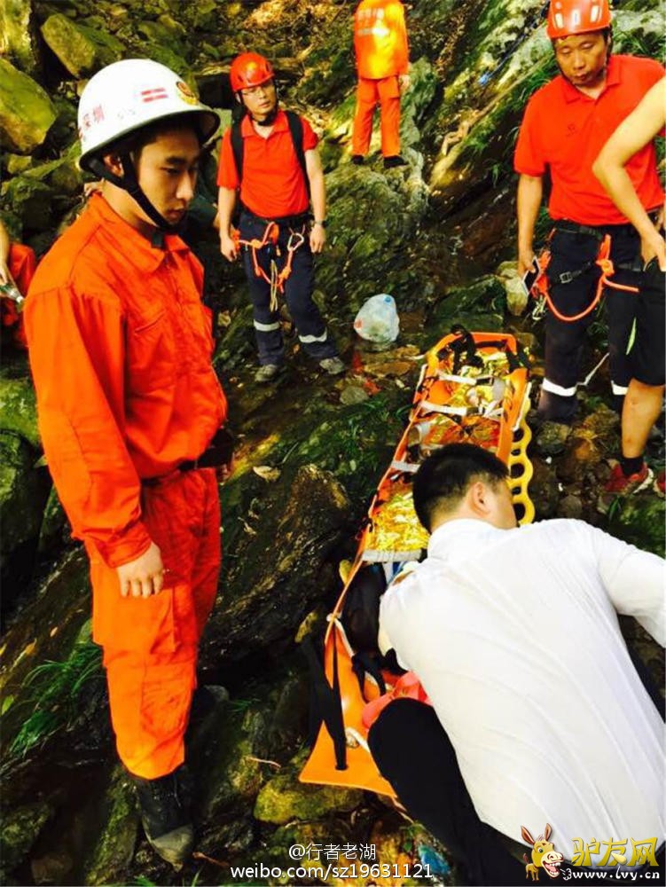 驴友网9月6日,四男一女总共五名驴友相约登深圳梧桐山,其中一人不慎掉落山崖。接到报警求助电话,民警立即赶往现场救援,找到跌落山地的游客时发现游客头部受伤严重。图中被救助的男子受伤严重。
