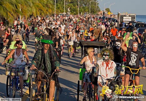 : 当地时间2014年10月19日,美国佛州基维斯特,当地年度幻想节期间举行“丧尸大骑行”活动,约7000人装扮成丧尸参加。