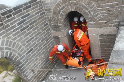 人民网北京10月21日电 据北京市公安局官方微博消息,昨日,北京消防接到报警称一名游客被困野长城,到达现场后发现被困者是一名60岁左右外籍女游客,因踩到碎石不慎摔伤,多处骨折,右肩脱臼并有轻微脑震荡。