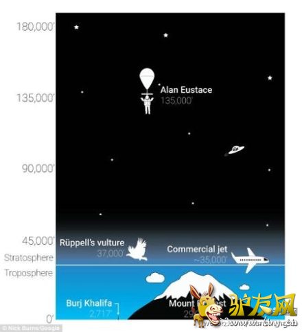 美国谷歌公司高管艾伦尤斯塔斯24日从超过4万米高空跳伞并平安落地,创跳伞高度新纪录。尤斯塔斯现年57岁,为谷歌高级副总裁。他当天在美国新墨西哥州乘坐高空热气球升空,耗费两个多小时抵达13.589万英尺高空。 ![]() 停留大约半小时饱览壮丽景色后,尤斯塔斯一跃而下,以自由落体状态飞速坠向地球,持续大约4分半,最高速度达到每小时1322公里,超过音速。他在离地大约1.8万英尺打开降落伞并安全落地。美国跳伞协会现场监督人员说,听见了尤斯塔斯高速坠落时产生的巨大音爆。 ![]() ![]() ![]() ![]() ![]() 先前的高空跳伞纪录由奥地利人费利克斯鲍姆加特纳在2012年创造,地点也是新墨西哥州上空。时年43岁的鲍姆加特纳从大约12.8万英尺跳下,最高坠落速度也超过音速。 |