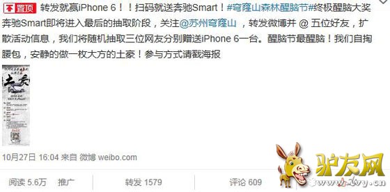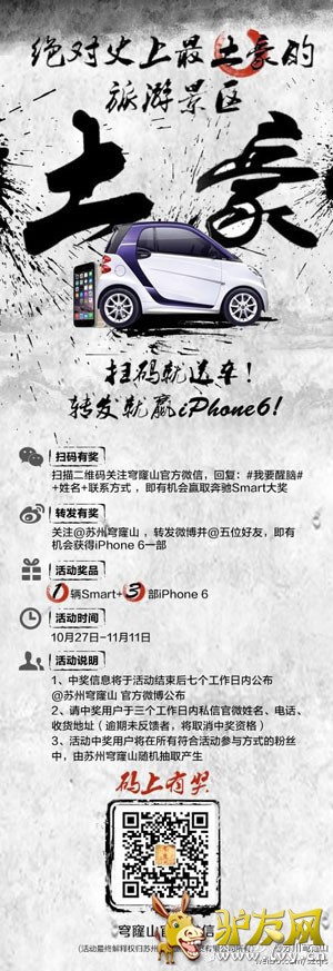 2014年10月27日下午,苏州穹窿山官微在发布了一条转发有奖的微博,该微博现已置顶,不到一天时间就收获了上千人次的转发与评论,不少网友惊呼:"穹窿山真是太土豪了!"![]() 究竟是怎样的奖励,能让网友们如此感叹并且纷纷转发评论呢?据悉,这次微博有奖活动是穹窿山森林醒脑节进入收尾阶段对粉丝们的一个回馈与奖励,奖品是3部iPhone6和一辆奔驰Smart,土豪气质显露无疑。 ![]() 2014年9月初,苏州穹窿山景区举办了第一届"森林醒脑节",这是一场全民醒脑活动,以节日的形式提醒广大公众,别让自己的生活被钢筋水泥的城市森林捆绑,走入真正的天然森林,让大脑醒来,让心灵释放,重拾对生活的热情与活力。 ![]() 据了解,这次森林醒脑节举办的相当成功。除了穹窿山现场举办的森林大party以外,穹窿山森林醒脑节在网络上也进行了一轮又一轮大力传播,邀请了张辛苑等极具号召力的网络红人作为醒脑代表,通过社交平台与大家分享交流,由此号召更多人加入醒脑队伍,一起森态醒脑摆脱负能量。 首届穹窿山森林醒脑节,即将在2014年11月11日结束,活动现已进行到收尾阶段,醒脑大奖奔驰Smart得主也将会在11月11日隆重揭晓。为了让更多人参与大奖的抽取,穹窿山景区更是奖上加奖,再赠3部iPhone6!让大家把肾留住! ![]() 更令人为土豪点赞的是,不论微博还是微信的有奖活动,参与方式都极其简单。想要iPhone6只需关注@苏州穹窿山 新浪微博,转发微博并@五位好友就有机会获得。微信端的参与方式更加简单直接,只需扫描二维码关注穹窿山官方微信,回复"#我要醒脑#+姓名+联系方式",即有机会赢取奔驰Smart大奖。 如此重量级的有奖转发活动还真是且转且珍惜,穹窿山的确担得起"史上最土豪旅游景区"的称号。 |