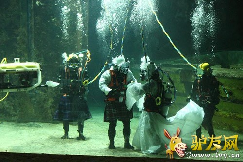 中新网11月26日电 据外媒报道,在苏格兰威廉堡的“水底世界”,37岁女潜水员班科夫斯卡与大她两岁的丈夫阿博特在4米深的潜水缸内举行了一场水下婚礼。在缸外100位嘉宾的见证下,两人通过特制头盔的通讯设备交换誓言。
