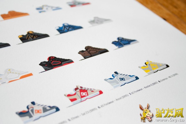 真正专业的滑板鞋,其实跟潮流没什么关系,滑手们比较注重实用性,因为每天认真地玩滑板,做花式动作时,板上的砂纸很快就把鞋子外侧磨穿,一两个礼拜就要更换。所以款式上也并不花俏,最多也是“百搭”风格。 而今回艺术家 Nathan Manire 就带我们回到上世纪 90 年代,评选出滑手心目中的最佳 10 大最佳滑板鞋型号,并把它们画成了简约卡通风格的插画。我们看到了现在还很火的 Vans Chukka Boot 和 Half-Cab ;滑板界大名鼎鼎的 3E - Etnies 、Emerica 和 eS 均有上榜;基本上消失人前的 eS 当年才是出正宗 Koston 1 的第一代。懂滑板的人会很有感触,不妨看看你穿过那几双? 以下是入选鞋子型号: 1.Vans - Chukka Boot (1990) 2.Vans - Half-Cab (1992) 3.Airwalk 1One (1993) 4.Etnies - Sal 23 (1995) 5.Duffs - KCK (1995) 6.eS - Accel (1995) 7.eS - Koston 1 (1997) 8.Emerica - MJ1 (1998) 9.Emerica - Reynolds (1998) 10.DC Shoes - Lynx (1998) |