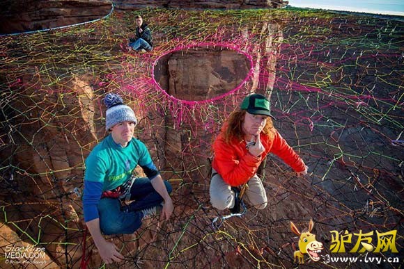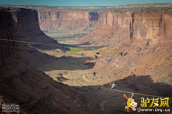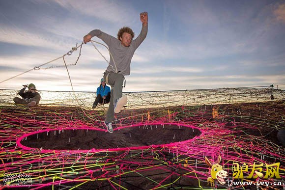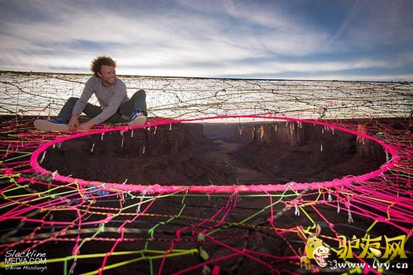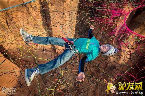 据外媒报道,一群美国极限运动爱好者在犹他州摩押山的峡谷中架起彩色织网,只身走绳索、低空玩跳伞,完全没有一丝恐惧,反而玩得十分随意。