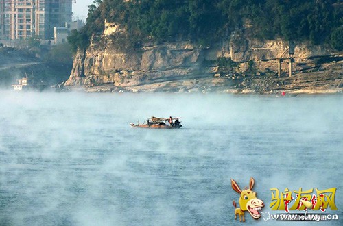 : 2014年12月17日清晨,湖北宜昌,长江江面水雾蒸腾如仙境。据气象专家介绍,这是由于宜昌近日出现急剧降温天气,长江水温高于气温所致。中新社发 刘君凤 摄