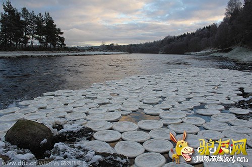 : 当地时间2014年12月18日,英国苏格兰迪河上漂浮着松饼状的冰块。生物学家Jamie Urquhart表示这是由于泡沫漂浮在水面上,开始结冰并且相互碰撞,才会形成这种形状。