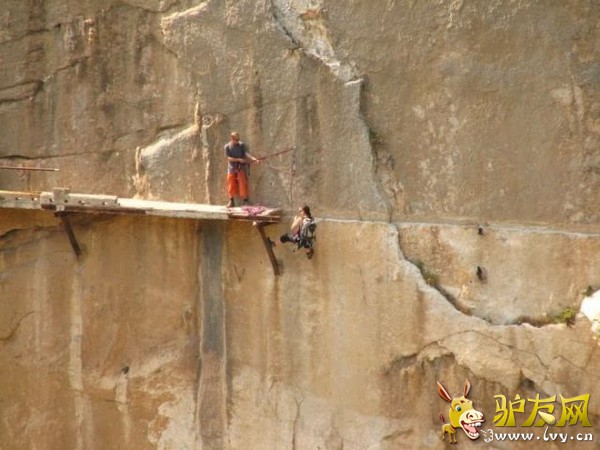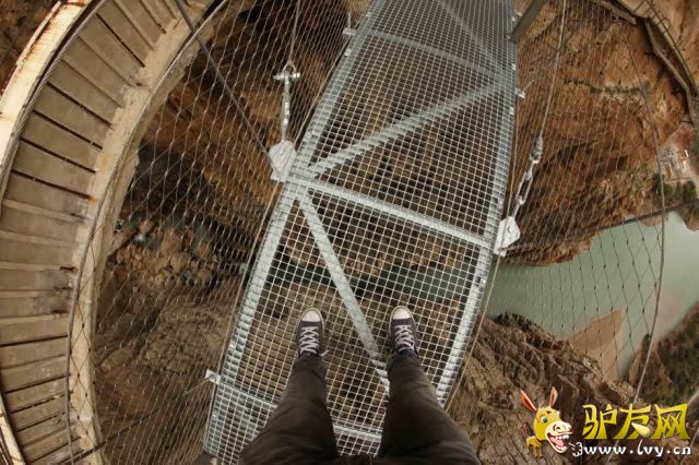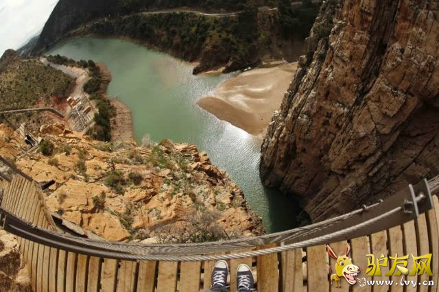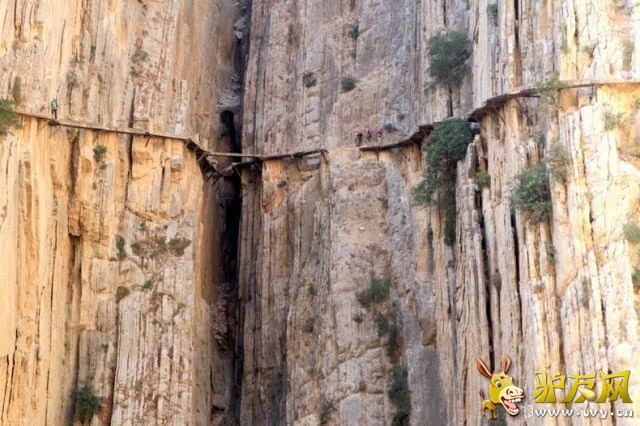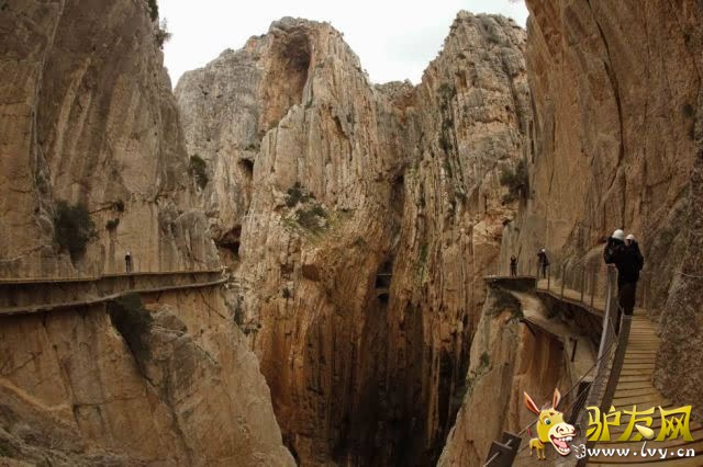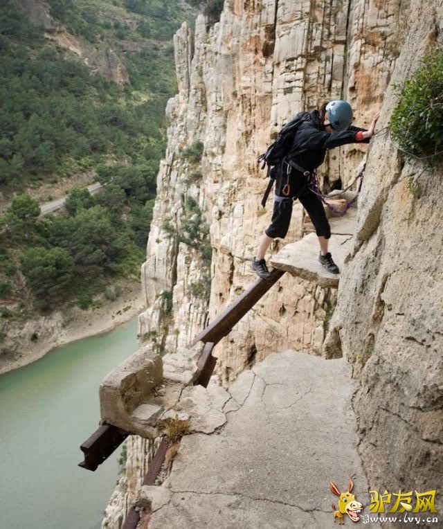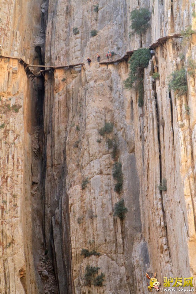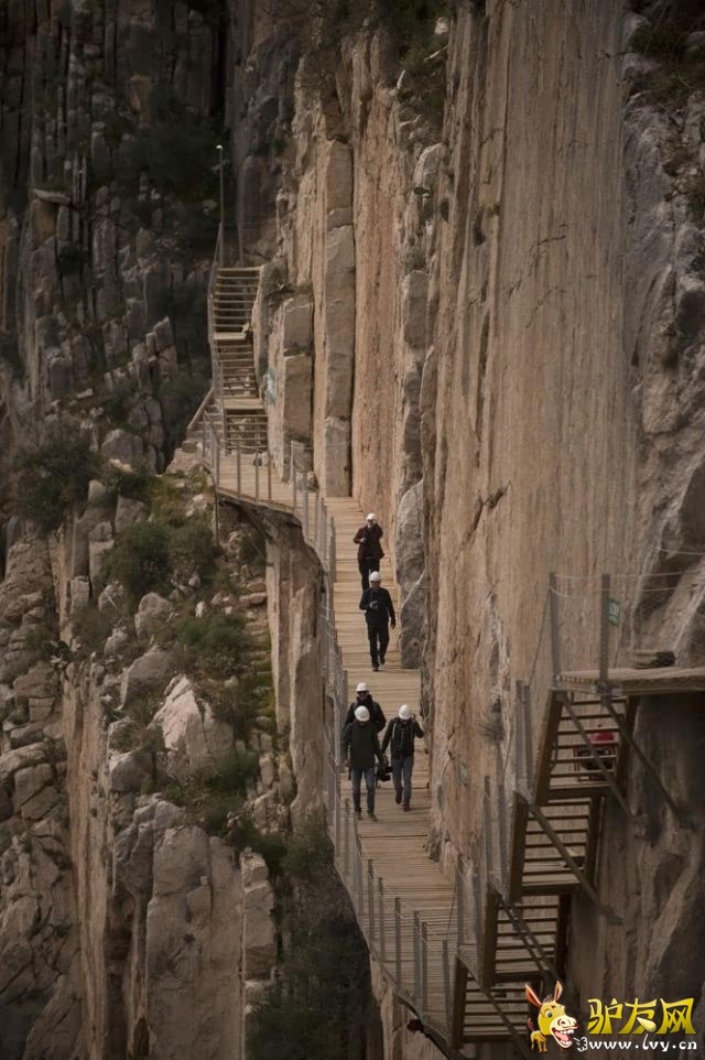 在1901年,在西班牙南部开通了一条能运送人与货物的山路! 1905年,国王的小路俨然而生。但久经失修,被废弃的这条路又是何其险恶。尽管已有许多路段坍塌,但却成为登山者的挑战目标。 仅仅在1999到2000年时,至少4位探险家在这边国王的小路上丧失他们的生命。于是当地政府下令关闭两边通道,但仍挡不住跃跃欲试的登山者们。从远方遥望峡谷,会见到一条细细,绵延整座山谷的线,近看才知这条微妙的线条,其实是以金属构成的道路,远看行走在路上的登山者们就像蚂蚁一样,人看了都捏一把汗!这条钉在峭壁上的危险步道,部分路段有护栏,但更多的路旁乃空无一物,头一下探就是陡直的峭壁,在山间的桥看似宽敞安全,真正走过,才会发现这里可没有供登山者使用的安全绳索。许多爱好此道的勇者,却喜于能感受到那种敞开胸襟,置生死于外的豁达。