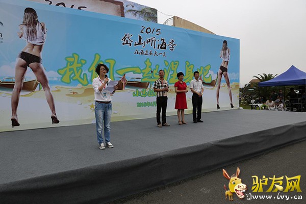 接下来,各位特约嘉宾上台为大家致辞。王佩副局长充当主持人上台为大家解说,首先是於国安局长为大家介绍岱山的魅力和蓬莱仙岛的激情,他对远道而来的游客表示欢迎,并说明此次活动是符合年轻人品味的新一届岱山听海节,倡导给予大家体味真正的原味海生活;接着是杭州安盛广告董事长方林军向大家介绍此次的活动安排,有湿身跑、撕名牌、沙滩运动会、比基尼秀、音乐会等,让下面的人们振奋不已。 最后在岱山人民政府副县长俞赛飞发枪,“现在我宣布2015岱山听海季湿身跑现在开跑”,热情昂扬的湿身跑运动开始。