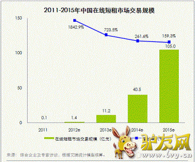 在线短租行业的出现,满足了中国旅游市场正在高速崛起的以 “自由与个性”为价值核心的短期住宿需求,同时提高了社会闲置房源的利用率。虽然蚂蚁短租进入市场晚于爱日租、游天下等短租网站,但现在看来蚂蚁短租显然已经后来者居上。 据艾瑞统计数据显示,2012年是中国在线短租市场的加速年,总计市场交易规模将达到1.4亿元,增长约达18倍, 到2014年短租市场交易规模突破40亿元,直至2015年短租市场规模有望突破105亿元,环比增长159.3%。而第三方研究机构速途研究院也预测到2015年市场规模将超过100亿元,环比增长163.0%。这样惊人的数据背后蚂蚁短租可谓出力不少。