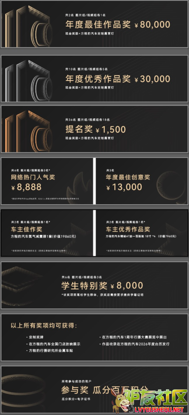 方程豹汽车迎来意义非凡的成立一周年。旗下行摄研究所在此之际,启动“方程豹汽车1周年行摄大赛”,旨在汇聚全球摄影爱好者的镜头,挖掘并展示其独特的视角与才华,与方程豹汽车深入践行与用户共创美好生活的核心理念。 本次行摄大赛设立了六大主题赛道。无论是拍摄专家,还是影像新锐,只要热爱摄影并期待展示自己的作品,都可参与本次大赛,与众多优秀摄影师共同创作更多优质内容,共筑方程豹的视觉盛宴。 征稿时间: 2024年8月25日-2025年3月31日 获奖公示时间: 2025年4月30日-2025年5月6日 颁奖典礼及摄影巡展 :2025年5月 - 2025年7月 1、【 投稿规则 】 本次大赛的投稿渠道现已开放,参赛者可通过8KRAW官网进行投稿,2024年8月25日至2025年3月31日,参赛者可登陆8KRAW官网,方程豹汽车官网提交参赛作品。作品规格具体要求如下: 视频作品要求: mp4格式、分辨率为1920*1080、视频数据500MB以下,时长大于30秒且小于5分钟。 图片作品要求: jpg格式,单张照片数据在5MB以下,长边不超过30000像素,组图需大于5张。 2、【赛道介绍】 本次大赛要求参赛作品以方程豹汽车为主要拍摄对象,参赛者可选择六大赛道中任一主题进行投稿,作品需满足赛道主题。 航拍:以方程豹汽车为主要拍摄对象,以空中拍摄展示为主,展现城市、山野、海岸线等元素,发现不一样的风景。 人像:以方程豹汽车为拍摄道具,以人物为主要拍摄对象,可拍摄儿童、朋友、父母等,展现生活方式,传递人文情怀。 风景:以方程豹汽车为主要拍摄对象的风光景观、天象景观、城市景观、动物等。 故事:以方程豹汽车为载体,用摄影讲故事,捕捉生活中的小确幸。 光影:以方程豹汽车为拍摄道具,用光影的艺术呈现影像画面,带来光影交错的视觉盛宴。 户外运动:以方程豹汽车与户外项目的结合为主要拍摄对象,如滑雪、山地自行车、越野等。 3、 【 奖项设置 】 本次大赛设置高达100万元的丰厚奖金池,共计89个奖项,包含年度最佳作品奖视频图片组各1名、年度优秀作品奖视频组图片组各5名、提名奖视频组图片组各18名、年度最佳创意奖3名,网络热门人气奖图片组视频组各3名,车主佳作奖视频组图片组各1名、车主优秀作品奖视频组图片组各12名、学生特别奖图片组视频组各3名。其中网络热门人气奖将在比赛征稿期结束后由方程豹汽车APP发起投票。除此之外以上获奖者还有机会成为方程豹汽车签约摄影师。 4、【大赛评委】 本次大赛的评审团阵容强大,方程豹邀请到了一批在汽车、摄影领域具有深厚造诣和丰富经验的行业专家。他们包括方程豹汽车CEO熊甜波、包括8KRAW创始人王源宗、8KRAW联合创始人lingchen、2019年国家地理摄影大赛全球总冠军Thomas看看世界、喜马拉雅高山摄影师马春林、军航退役军人航拍联盟创始人航拍摄影家大圣、《航拍中国》无人机导演航拍v。这些评审不仅在专业领域享有盛誉,更具备敏锐的艺术洞察力。他们将在创意性、技术性、主题契合度及情感表达等多个维度,对参赛作品进行全方位评审,确保大赛的公平、公正与权威。 |