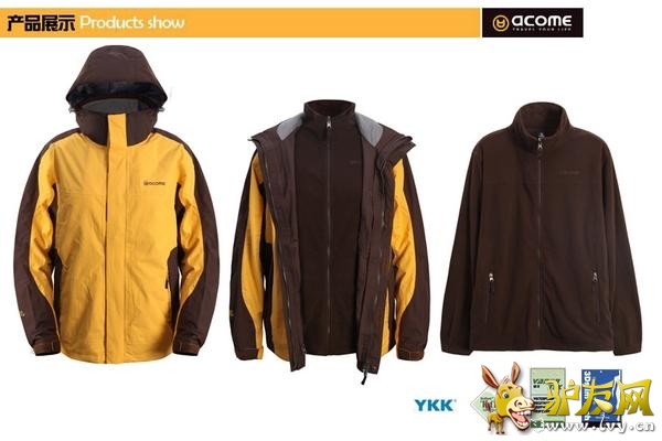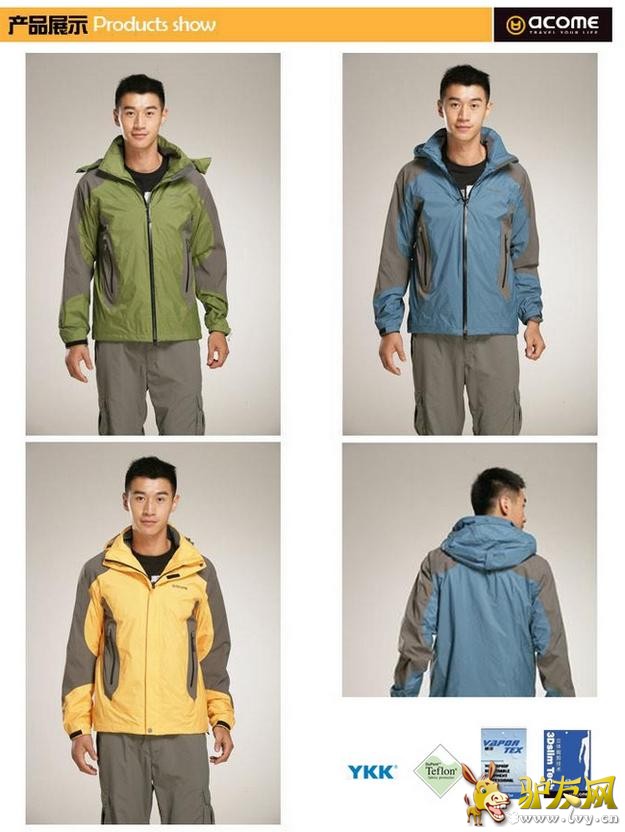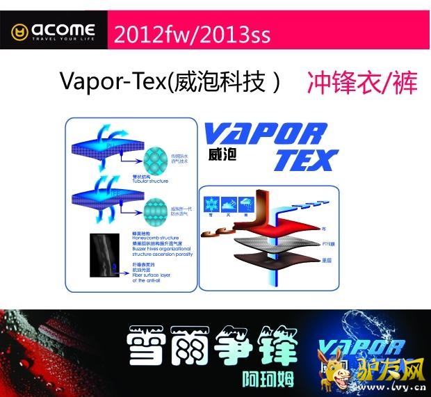 正因为ACOME阿珂姆专利的“VAPOR-TEX”(威泡科技),才使得适合户外旅行的ACOME阿珂姆冲锋衣产品防风、防雨、防雪、防污、且不失透气功能。 VAPOR-TEX(威泡科技)的核心是膨体聚四氟乙烯(PTFE),改善了传统防水运用PU层通过温差吸附汗水、降低透气的缺点,其蜂巢式的材料组织结构能保证防冷风侵入、降低热能散发,有效阻隔水份渗入,同时提升了透气度。除了优越的透气结构,VAPOR-TEX(威泡科技)还具有纤维表面抗油污层,可避免产品被油脂、汗水、防晒品的沾污。为此由VAPOR-TEX(威泡科技)面料制成的ACOME阿珂姆冲锋衣在平日里无需特别打理;收纳前用温水洗涤,底温熨烫;不可拧扭、干洗、氯漂等即可。 目前ACOME阿珂姆冲锋衣所运用的VAPOR-TEX(威泡科技)数值主要有两种, 分别如下: ⑴ VAPOR-TEX(威泡科技) 5000+ 适合着装环境:都市休闲、郊外旅游 对于雨雪、大风、低温的天气环境有一定要求 对于防水性和防风性有所需要 能偶抵挡小到中雨雪寒冷的气候有所保暖的功能 天气较好的环境中具有快速的透气作用 推荐款:AG122S1003特里尔男式三穿冲锋衣 上市时间:2012年9月 尺码:S/M/L/XL/XXL/XXXL 颜色:黄色/深咖色 深灰色/黑色 大红色/煤灰色 豆绿色/军绿色 钴蓝色/煤灰色 青蓝色/夜蓝色 橄榄绿色/茶绿色 面料:100%锦纶 转帖5K/5K TEFLON处理 主要特点: 1. VAPOR-TEX科技,高效能防风防水防污; 2. 可调节防风帽设计,有效抵挡风雨侵入; 3. 内配可推卸抓绒内胆,循环锁热,抗静电处理; 4. 高品质YKK拉链,经久耐用; 5. 3Dslim Tech立体剪裁,更加合身舒适. ACOME天猫商城: http://detail.tmall.com/item.htm?spm=a220m.1000858.1000725.1.7e96de&id=17151939547&is_b=1&cat_id=2&q=AG122S1003