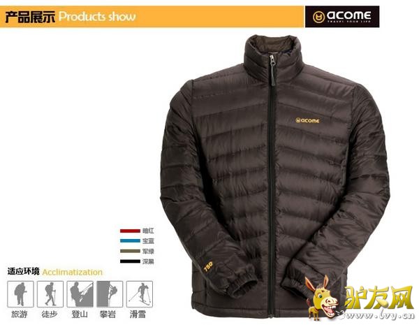 2012年的雪花已经悄然落下,伴随着入冬的节奏,备一件保暖又轻巧的羽绒服无疑是一个正确且潮流的选择。 以往,大家在购买羽绒服时都比较关注其填充物和含绒量,觉得这是衡量一件羽绒服保暖与否的重要指标。事实上,充绒量是指一件羽绒服填充的全部羽绒的重量,即羽绒里面绒的比例,换言之,含绒量仅代表羽绒服的“量”,真正代表羽绒服“质”的,是蓬松度。 蓬松度(Fill Power),是国际上度量羽绒保暖程度的重要指标,指的是在一定条件下每一盎司(30克)羽绒所占体积立方英寸的数值。如一盎司的羽绒所占的空间为600立方英寸则称该羽绒的蓬松度为600。羽绒的蓬松度越高,说明在同样充绒量下的羽绒可以固定更大体积的空气层来保温和隔热,所以羽绒的保暖性越好。 这是相对于含绒量更重要的指标,蓬松度高的羽绒服不仅保暖性能好,而且轻便贴身,这也让羽绒服一改过去笨重的形象,在制衣轻巧上有了非常大的提升空间。 ACOME阿珂姆2012秋冬羽绒系列,真正关注羽绒制衣的品质,研发出550至800蓬松度的各款轻便羽绒服,既满足了御寒保暖的需要,也保证了不会约束活动的轻薄。尽管气候严寒,身着ACOME羽绒服,就阻止不了人们热爱户外、追求自由的心。 AG122D1026/AG122D2029 Fill Power 650+ 适合各种都市活动。 填充:100%白鸭羽绒(90%绒、10%羽),绒朵大、羽梗小、品质佳、弹性足、保暖强。 东丽"GRAM ART"克轻防绒面料,YKK拉链,可收纳入袋。 ●TMAIL商城链接: 男款:http://detail.tmall.com/item.htm?spm=a220o.1000855.w3.11.gplr7N&id=19851760174 女款:http://detail.tmall.com/item.htm?spm=a1z10.1.w3.11.uPH6mi&id=15904426128