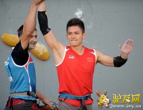 攀岩世界杯海阳分站钟齐鑫获速度冠军 赛后庆祝