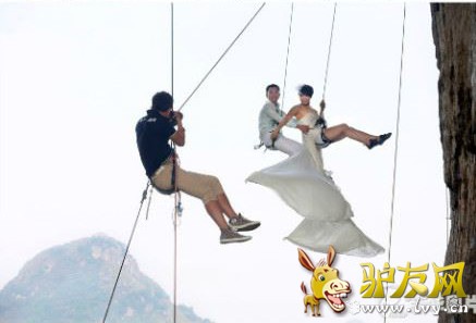 10月26日,广西柳州,方静和先生老赵一起拍摄婚纱照。他们俩都是户外运动爱好者,所以选择来到柳江县六岩村一处攀岩地点拍摄婚纱照。爬到离地面20米高的悬崖上,挂在半空3个多小时,他们拍摄了一组“勇敢者”的婚纱照片。