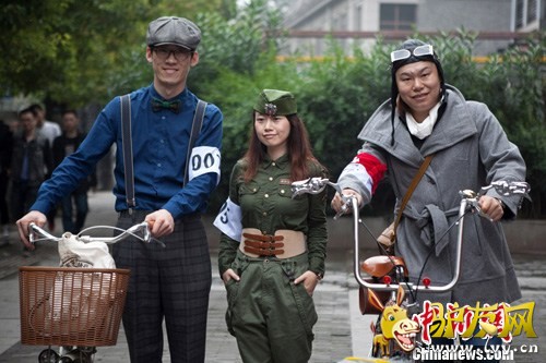 11月2日,近百位年轻人穿着各种复古服装,或淑女、或绅士,或海魂衫,脚踏着各种老式自行车骑行在南京街头,从中山门到中山东路再到太平南路,最后集结在具有民国建筑复古气质的1912时尚街区集体亮相,成为了周末一道流动的风景。复古骑行是2009年在英国伦敦发起的一项单车横跨市区运动,参加这项自行车比赛的"骑士"必须身着古典绅士服饰,骑复古自行车。