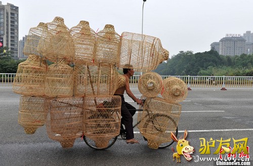 福州“笼人”骑车上路仅露半个脑袋 如同耍杂技