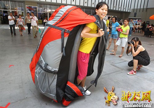 : 7月24日,一位参观者背着超大旅行包拍照留影。 当日,为期四天的2013(第八届)亚洲户外用品展览会在南京国际博览中心开幕,来自22个国家和地区的610家参展商参展,除了现场各种户外品牌展示外,还举办亚洲户 ...