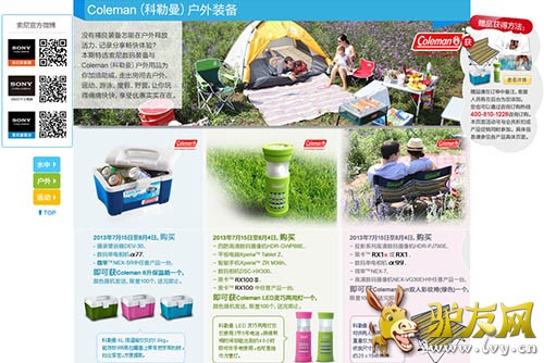 火热的七月,你是否也想寻找一个清凉去处? Sony索尼、 Coleman科勒曼应运携手,共同打造清凉七月露营季,让你在火热的七月清凉到底!火热沉闷的空气瞬间解冻,清凉舒爽的感觉顿时流淌开来。 ![]() 索尼从北京、上海、广州、成都四个大城市,挑选了上海淮海路店、上海南京东路店、北京东方广场店、北京悠唐广场店、广州太古汇店等7家Sony Store索尼直营店,进行Coleman科勒曼产品故事的陈列,为进店消费者提供强有力的露营视觉冲击,提供了一个了解、体验 以及购买Coleman科勒曼露营产品的场所,同步,线上索尼店也不甘示弱,无论从页面风格还是各方面宣传,也做足了功课,让此次露营合作完美腾飞,同时,Coleman科勒曼线上经销商------美国最大的一家网络电子商务公司-----亚马逊的折上折的活动加入,令此次活动更添无限风采,给消费者一次最大、最丰盛的暑期大餐。 没有精良的装备,怎能在户外释放活力?没有精密的数码,如何记录分享畅快体验?Sony索尼数码与Coleman科勒曼装备为你加油助威,走入户外 ,运动、游泳、度假、野营,让你玩得痛痛快快,享受优惠实实在在。 ![]() |